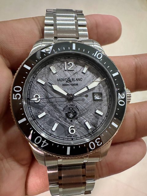 萬寶龍 1858 系列 Iced Sea 日期顯示自動腕錶採用灰色冰川圖案錶盤,給人一種深入冰川