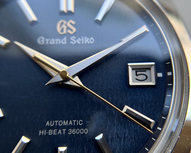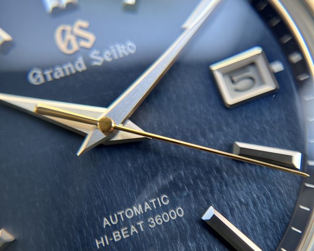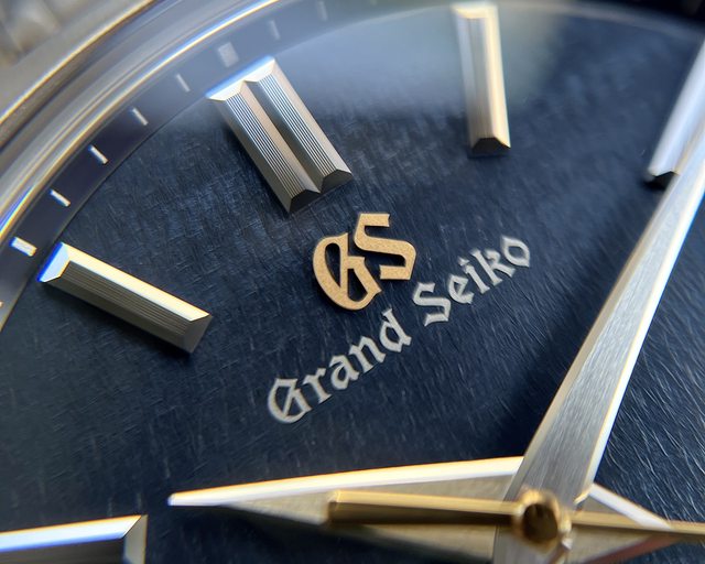 金色GS Logo和金色秒針搭配午夜藍細緻紋理錶盤,一如秋色月華照映著幽藍夜幕之景 頗