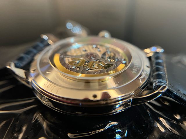 機芯透過拱形透明錶殼完全可見,錶殼背面的藍寶石玻璃幾乎達到了錶殼的邊緣,由於機