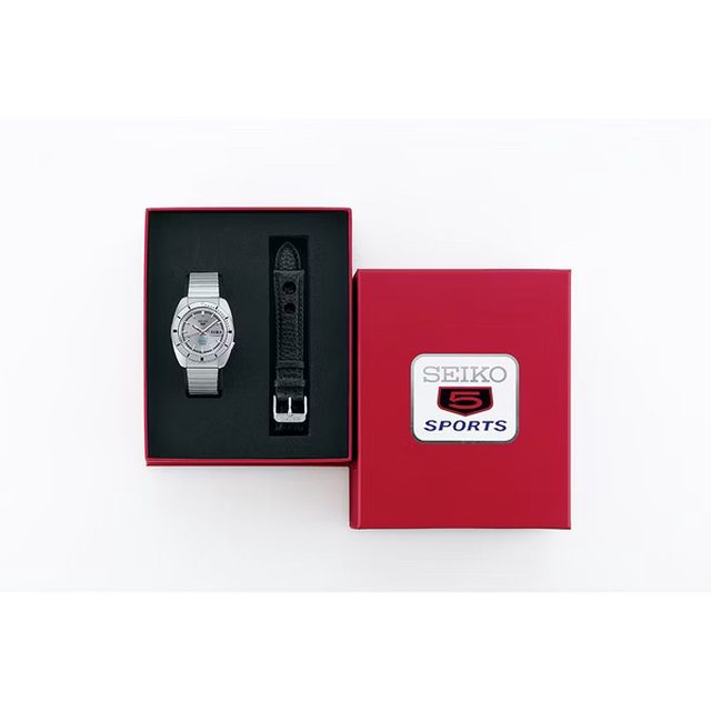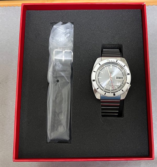 近期發表之限量復古Seiko 5,錶圈為雙向無級計時圈,殼型近似鮑魚殼,附贈皮帶為新