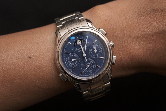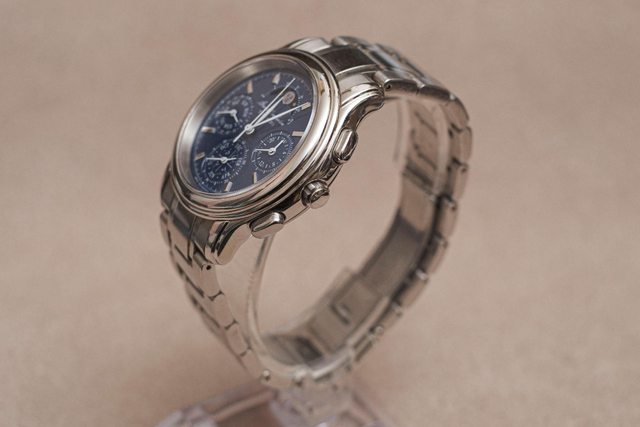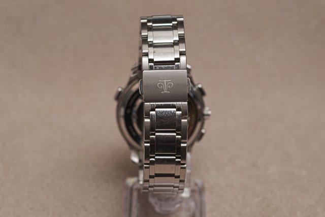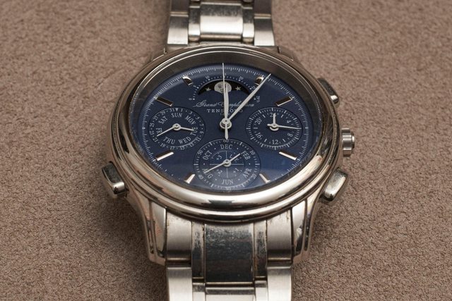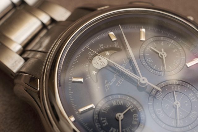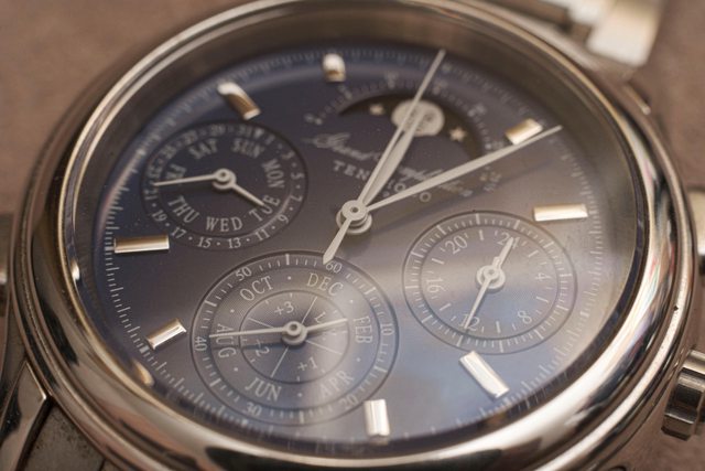 擁有複雜的石英機芯,包含四項功能:萬年曆、三問報時、計時碼錶、月相顯示。這支錶
