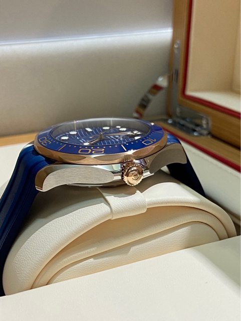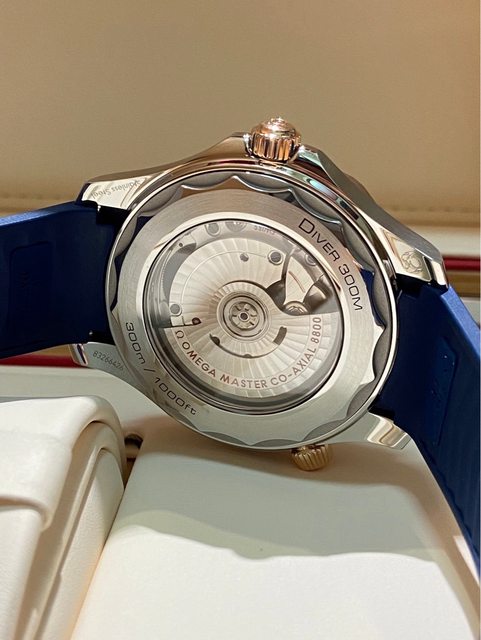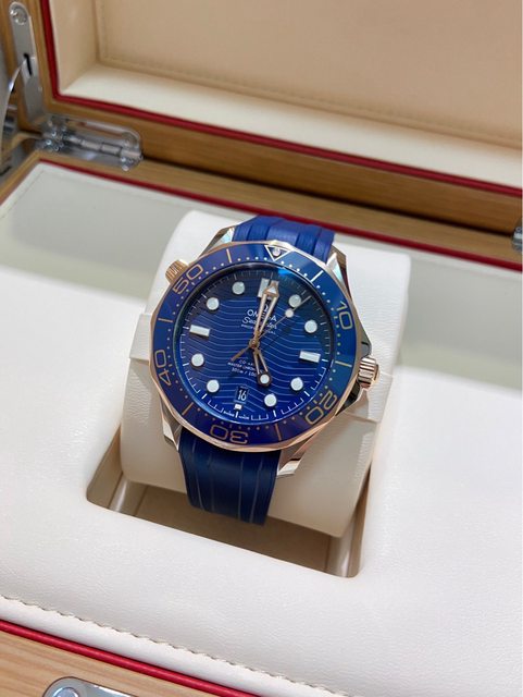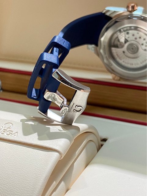 這款腕錶襯以藍色橡膠錶帶,搭載歐米茄8800