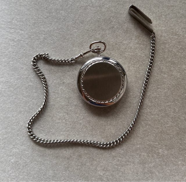 有點像月桂冠的裝飾,按壓上方龍頭可開蓋以及上鏈,內蓋有紀念刻印,搭配原廠懷錶鏈